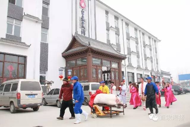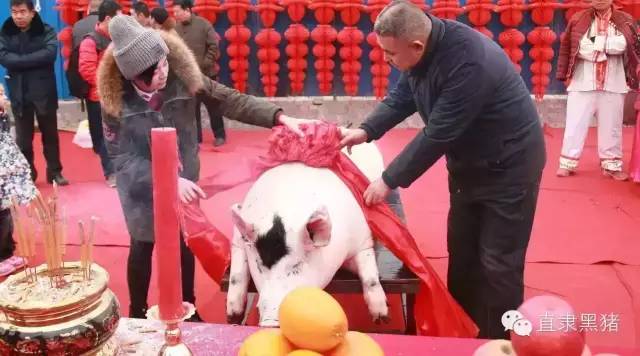 重达到398斤的年猪戴着大红花,先被赶着在广场内巡游一圈,验明正身,然后被抬上了一张板凳。直隶黑猪当家人赵卫东带领杀猪匠,虔诚的祭天祈福!祈福来年企业平安顺利、百姓富足安康!伴随着一声吆喝,几个“杀猪匠”卯足劲,杀猪、通杆、刨毛、剖边,拉开了“杀年猪”的序幕。神圣的杀猪仪式让人们对传统的民俗文化肃然起敬。最后这头接受人们的祭祀“还猪愿”作为今年的“猪福”最终以18800元的价格被人高价拍得。