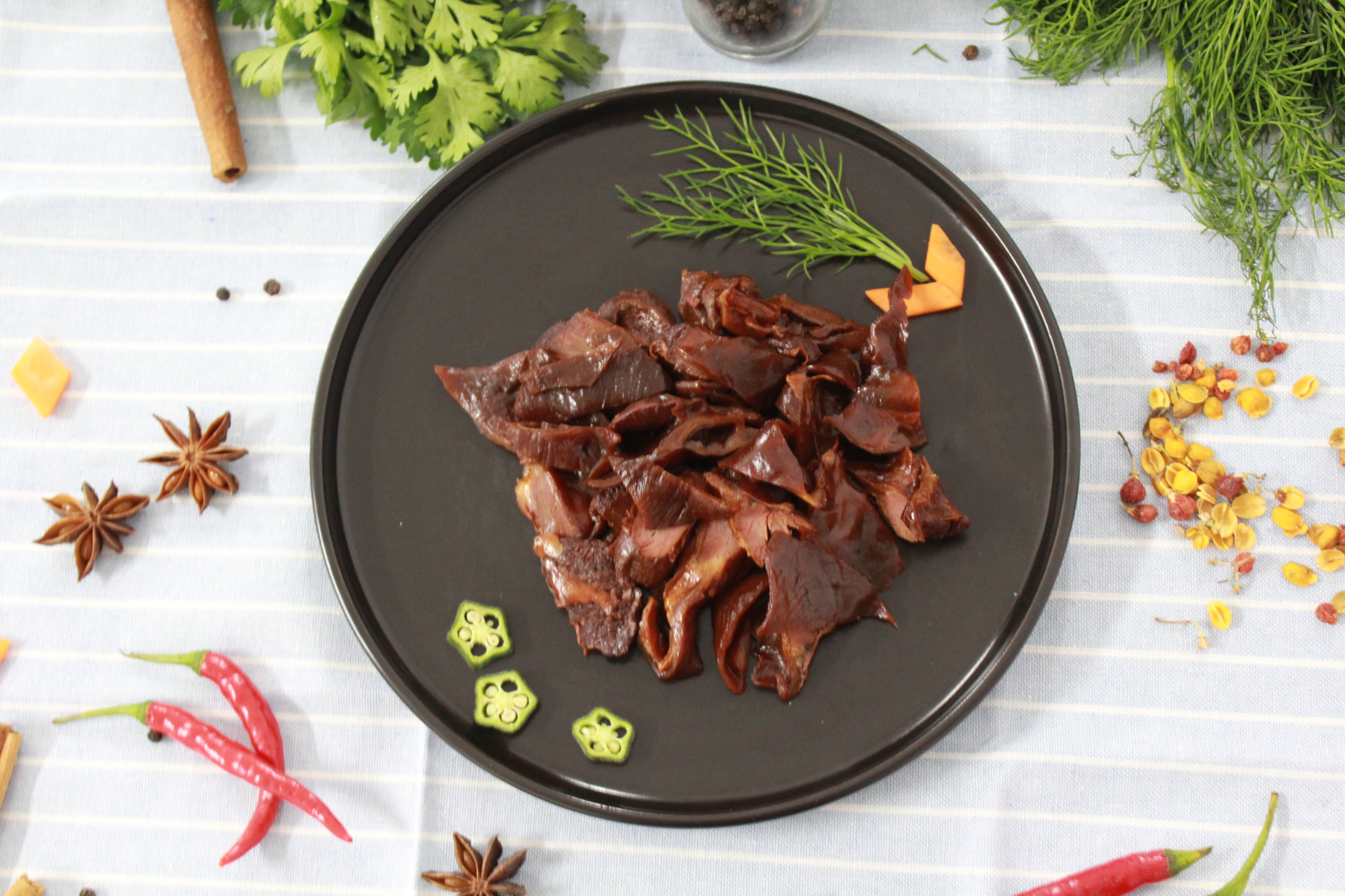 护心肉是纯瘦肉和筋膜相间,嚼劲十足。采用古法炖煮,肉香浓郁。开胃小菜,风味十足。