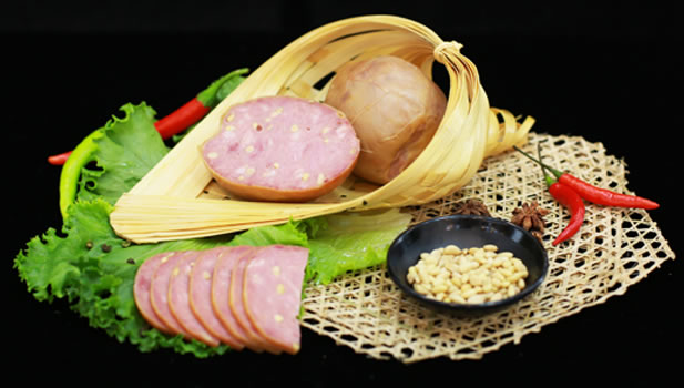 选用天然肠衣,包裹黑猪后腿肉,配以松仁辅料,口感滑中有脆,浓郁的风味感。